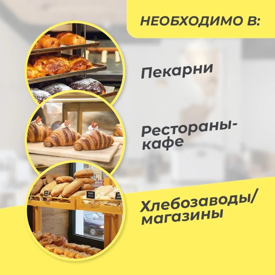 хлебозаводах и супермаркетах с собственными мини-пекарнями для профессионального использования.